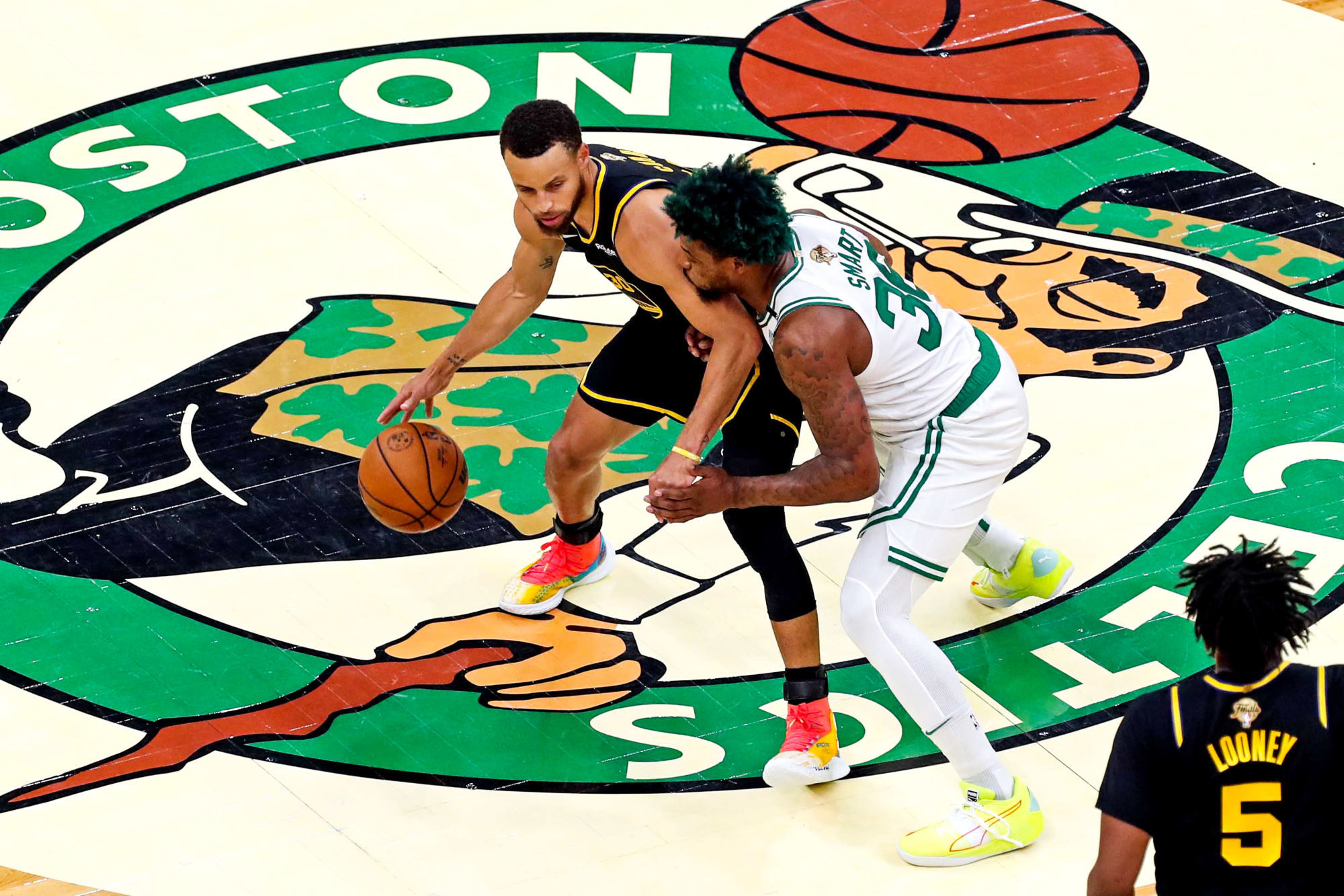 Récoltant les fruits d’une entame canon, les Celtics ont compté jusqu’à 18 points d’avance en première période. Mais le troisième quart-temps se profilait, celui durant lequel les Warriors savent faire de gros dégâts. Le sursaut a bien eu lieu, puisque les Californiens l’ont remporté (33-25), parvenant même à reprendre l’avantage au score (83-82) par Curry, alors auteur de sa sixième et dernière banderille à trois points (sur 11). Intenable le meneur venait d’être l’acteur principal d’une folle séquence, avec un autre panier à longue distance, la faute en prime de Horford, coupable même d’une flagrante. Résultat un lancer de plus, inscrit, et une remise en jeu Warriors qui a abouti à un autre tir primé de Otto Porter (6 pts). Soit sept points inscrits en une possession ! Dans le sillage de son « Splash Brother », Klay Thompson a lui retrouvé son adresse (25 pts, 5/13 derrière l’arc) et Andrew Wiggins s’est battu comme un diable (18 pts, 7 rbds). Au point qu’un trio semblait alors pouvoir répondre à l’autre. Mais le quatrième quart-temps est autant celui de Boston, à la défense retrouvée (23-11) à point nommé, que le troisième appartient à Golden State.