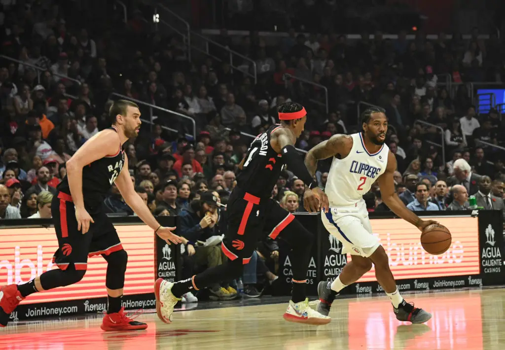 Nov 11, 2019; Los Angeles, CA, USA; LA Clippers forward Kawhi Leonard (2) dribbles the ball defended by Toronto Raptors forward Rondae Hollis-Jefferson (4) and center Marc Gasol (33) during the first half at Staples Center. Mandatory Credit: Richard Mackson-USA TODAY Sports/Sipa USA Photo by Icon Sport - Marc GASOL - Kawhi LEONARD - Rondae HOLLIS-JEFFERSON - Staples Center - Los Angeles (Etats Unis)