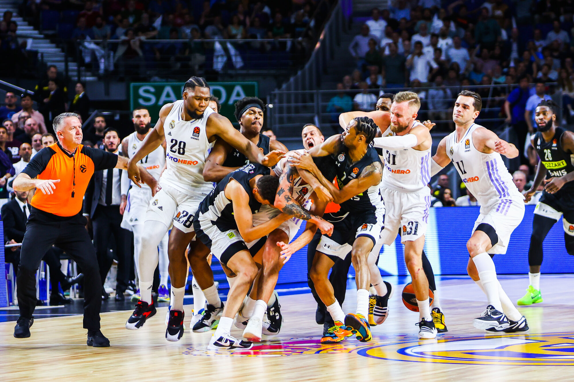 Le match entre le Real Madrid et le Partizan Belgrade en Euroligue n’est pas allé à son terme ce jeudi soir, arrêté après une bagarre générale sur le parquet alors qu’il restait une minute et quarante secondes à jouer. Les Madrilènes se dirigeaient vers une nouvelle déroute (95-80) après une première défaite mardi (89-97) avant qu’une cravate de l’Espagnol Sergio Llull, sur le meneur américain du Partizan, Kevin Punter, a lancé les hostilités marquées notamment par un plaquage-étranglement de l’international français de Madrid, Guerschon Yabusele, sur l’Australien Dante Exum. L’arrière du Partizan a quitté le parquet sur une jambe, incapable de