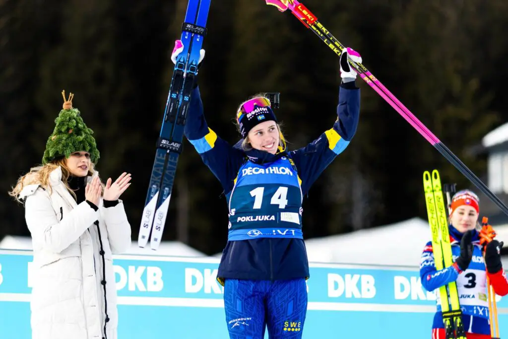 La Suédoise Elvira Oeberg, impeccable au tir, a signé le doublé sprint-poursuite à Pokljuka, en Slovénie. Le premier de sa jeune carrière. Elle se rapproche de Julia Simon, troisième de la poursuite samedi, qui conserve son dossard jaune de leader de la Coupe du monde de biathlon.