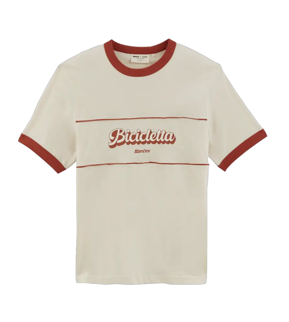 Le second t-shirt de cette collection arbore un design inspiré par Santini. Avec son col rond rouge contrasté et son imprimé « Bicicletta » sur la poitrine, ce modèle offre un style cool et décontracté en toute occasion. Le bas des manches en bord-côtes contrastés ajoute une touche de sophistication à ce t-shirt en 100% coton biologique.