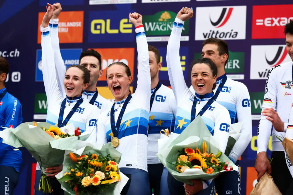 Audrey Cordon-Ragot, Cédrine Kerbaol, Juliette Labous, Bruno Armirail, Rémi Cavagna et Benjamin Thomas ont surpassé l’Italie de 4 secondes et l’Allemagne de 22 secondes pour décrocher la médaille d’or sous des conditions pluvieuses, après avoir déjà obtenu la médaille d’argent aux Championnats du monde à Glasgow en août.