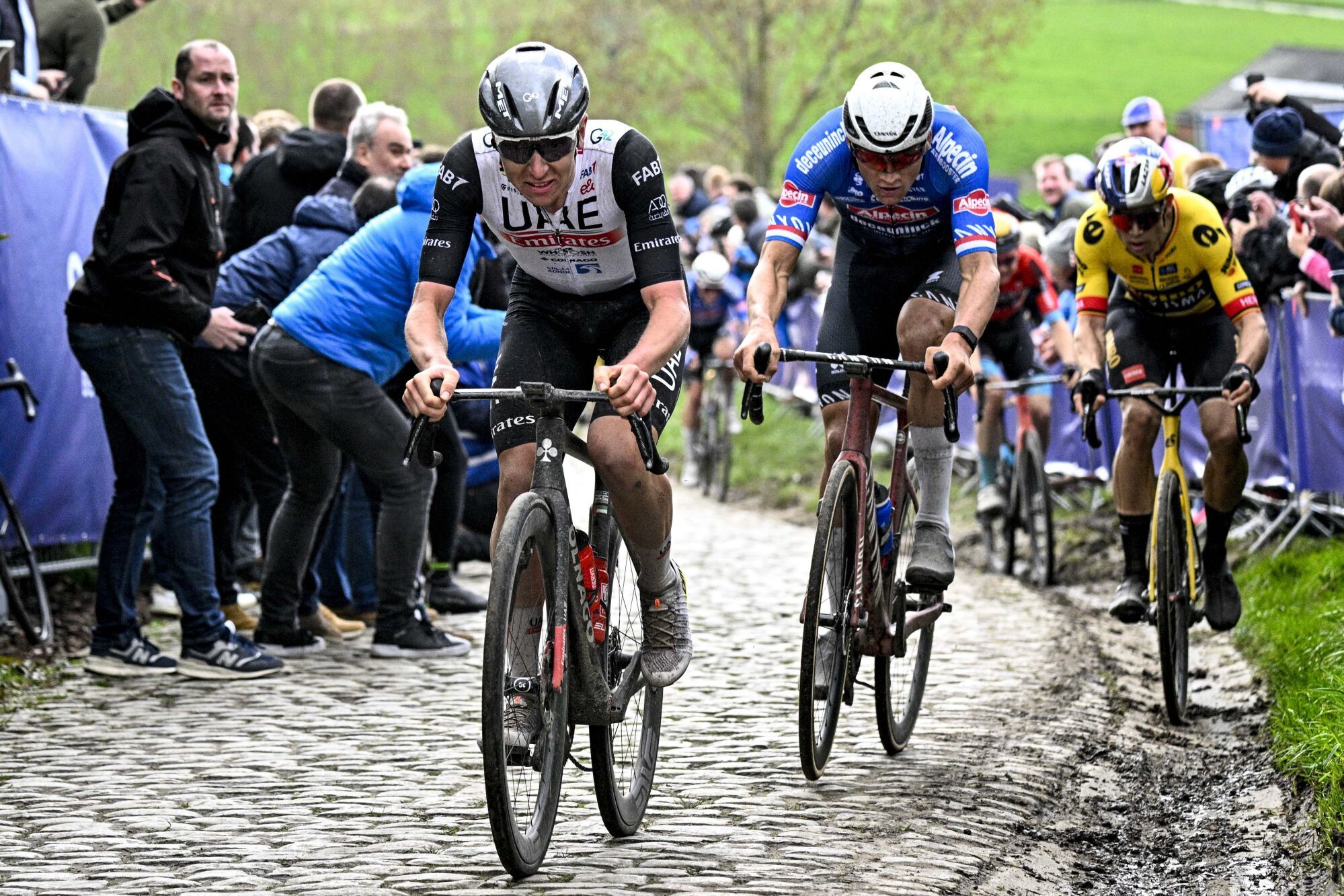 Ils étaient déjà aux avant-postes à Milan-Sanremo, remporté par Mathieu van der Poel. Ils ont poursuivi la lutte sur le GP E3 où Wout Van Aert a battu Van der Poel et Tadej Pogacar au sprint. Ces trois coureurs seront encore les grands favoris au départ de Bruges ce dimanche. Difficile de départager de les partager tant ils font preuve de qualités distinctes. L’année dernière, en l’absence de Van Aert covidé, Pogacar avait été le plus fort mais n’avait fini que quatrième, battu au sprint par un Van der Poel rusé et un duo de revenants, Dylan van Baarle et Valentin Madouas. Van Aert est au moins aussi fort que son rival néerlandais au sprint, alors que Pogacar a intérêt à semer les deux costauds s’il veut avoir une chance de l’emporter. Même s’il a montré quelques faiblesses sur les routes du GP E3, il paraît difficile d’imaginer un final sans le leader de la Jumbo-Visma, tant il a paru en forme lors de la victoire de Christophe Laporte sur Gand-Wevelgem.