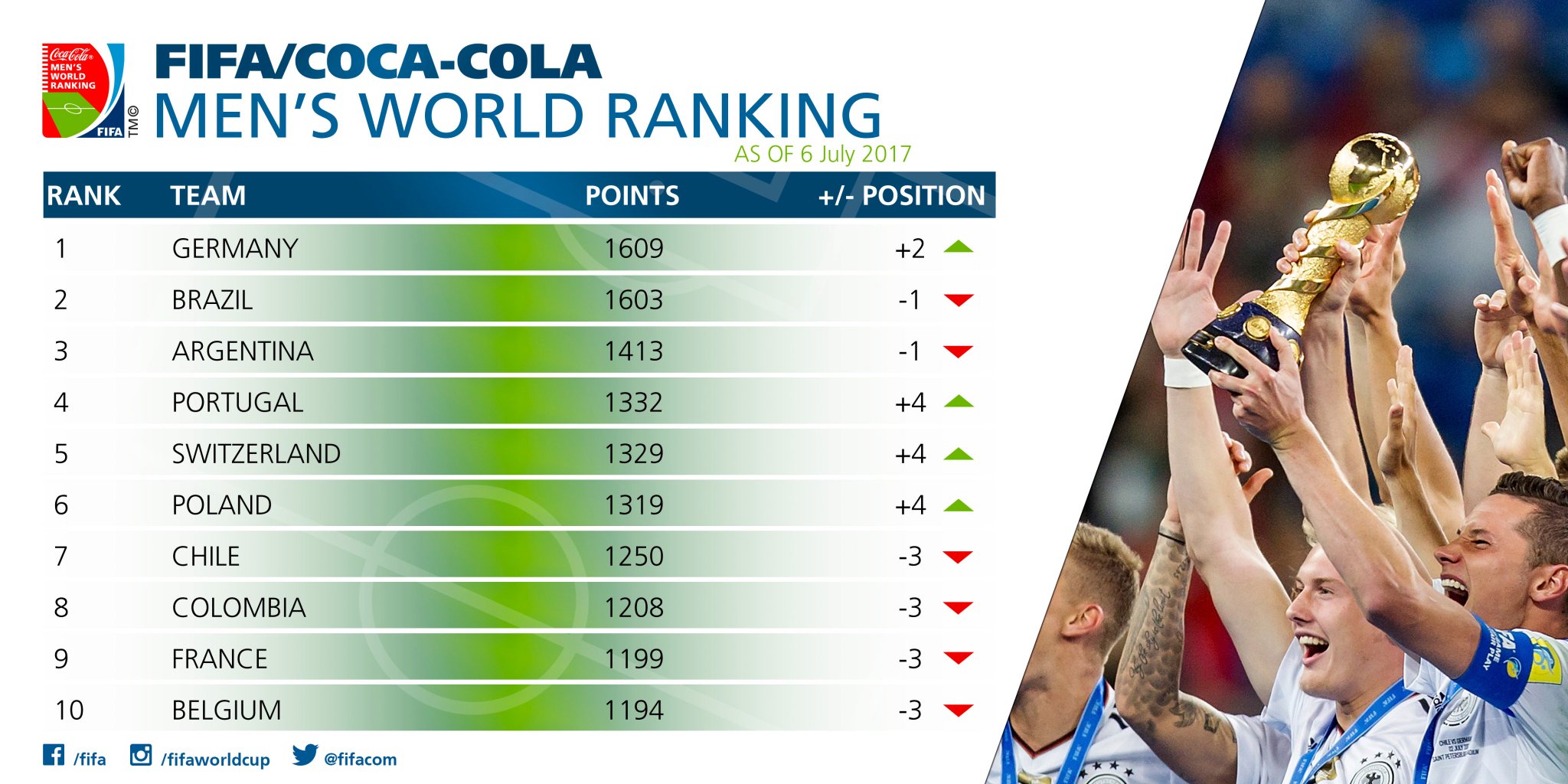 C’est officiel, le nouveau classement FIFA est tombé ce matin. L’Equipe de France perd trois places et se retrouve en 9e position. Côté surprise, la Pologne et la Suisse en 6 et 5e position. Le podium est sans surprise avec l’Allemagne, le Brésil et l’Argentine. La Belgique est 10e, l’Italie et l’Espagne ne sont pas dans le top 10 ainsi que l’Angleterre.