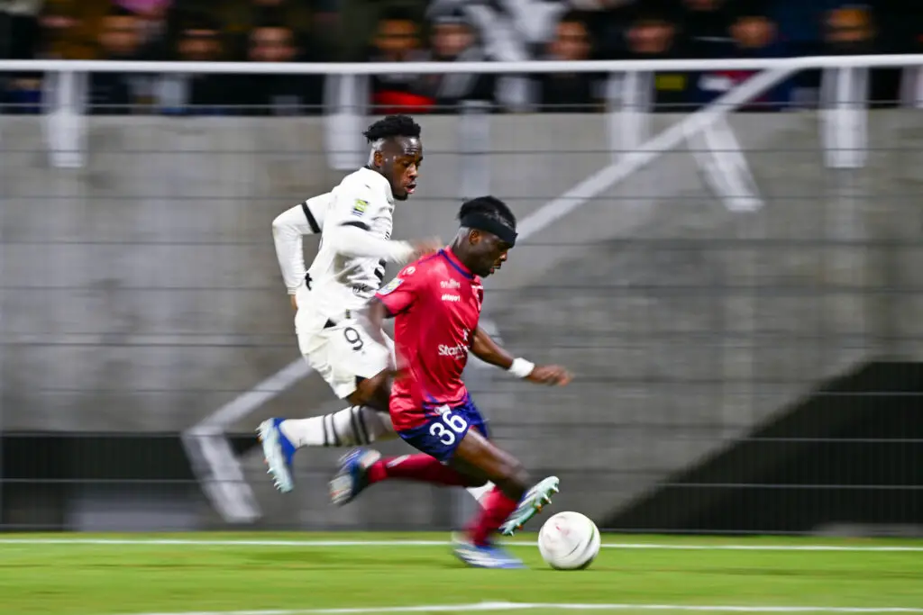 Arnaud KALIMUENDO of Stade Rennais and Alidu SEIDU of Clermont during the Ligue 1 Uber Eats match between Clermont Foot 63 and Stade Rennais Football Club at Stade Gabriel Montpied on December 20, 2023 in Clermont-Ferrand, France. (Photo by Anthony Dibon/Icon Sport)