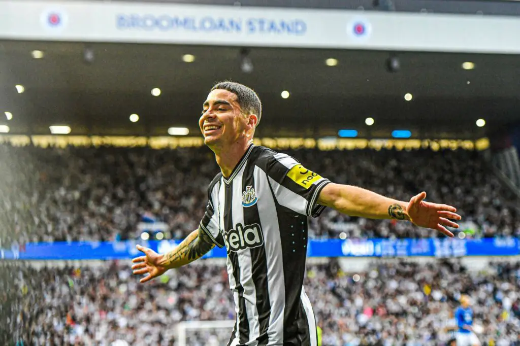 Miguel Almiron of Newcastle United scores their sides first goal of the match and celebrates his sides goal during the Pre-Season friendly match at Ibrox Stadium, Glasgow Picture by Jamie Johnston/Focus Images Ltd 07714373795 18/07/2023 - Photo by Icon sport