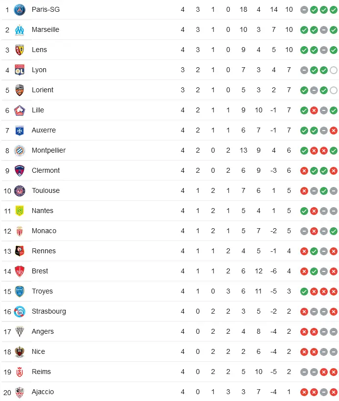 A l’issue de la 4e journée de Ligue 1, le Paris SG est toujours leader mais désormais talonné par l’Olympique de Marseille et le RC Lens. Les trois clubs ont 10 points et se départagent à la différence de buts. Lyon, avec un match en moins, est 4e à trois points. En bas de tableau, on relèvera la surprenante 18e place de Nice.