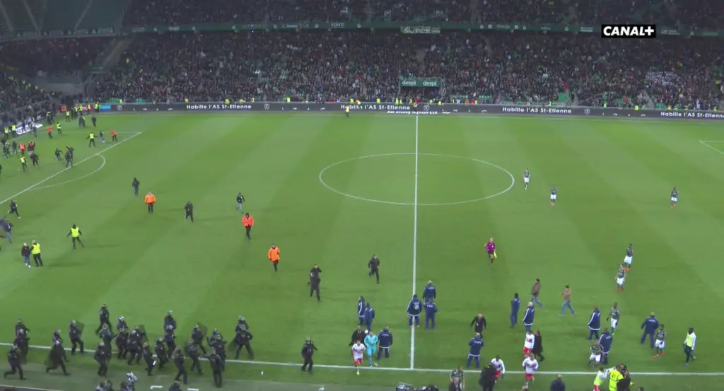 Le match vient d’être interrompu à la 85e minute de jeu après un envahissement de la pelouse par les supporters de l’ASSE. Pour rappel, l’OL mène 5-0 dans ce match.
