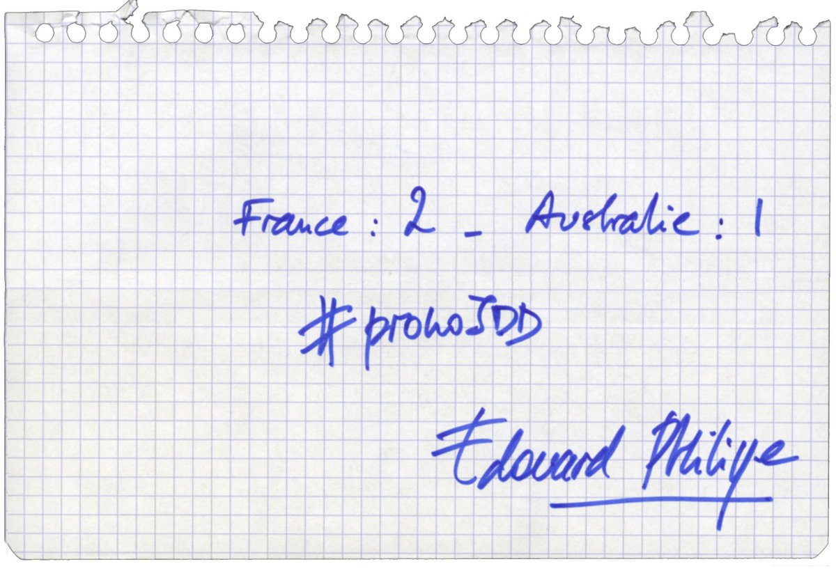 Dans le Journal du Dimanche, Edouard Philippe livre sur une feuille son pronostic pour le premier match des Bleus face à l’Australie lors de la Coupe du Monde 2018 en Russie. L’Equipe de France devrait donc s’imposer 2-1 face à l’Australie, samedi prochain (12h). Avis aux parieurs…