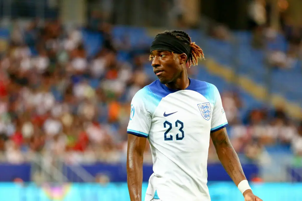 Batumi, Georgien, 28.06.2023: Noni Madueke (England) Schaut waehrend des Spiels der UEFA U-21-Fussball-Europameisterschaft zwischen England vs Deutschland, England vs Deutschland im Batumi Arena am 28. June 2023 in Batumi, Georgien. (Foto von Giorgi Ebanoidze/DeFodi Images) Batumi, Georgia, 28.06.2023: Noni Madueke (England) looks on during the Group C - UEFA U21 EURO 2023 Georgia/Romania match between England vs Germany at Batumi Arena on June 28, 2023 in Batumi, Georgia. (Photo by Giorgi Ebanoidze/DeFodi Images) - Photo by Icon sport