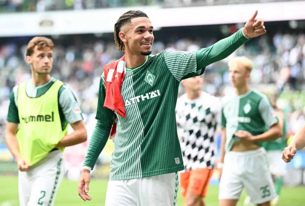Justin Njinmah (Werder Brême) satisfait après la large victoire à domicile (4-0) de son équipe face à Mainz le 2 septembre 2023. Photo by Icon sport