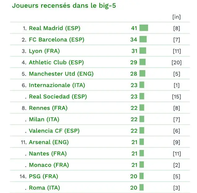 Avec 31 éléments, le club rhodanien occupe la troisième marche du podium, derrière le Real Madrid (41) et le FC Barcelone (34). Une seule autre formation tricolore figure dans le Top 10 : Rennes (22).