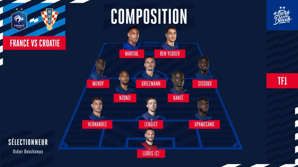 La composition : Lloris – Sissoko, Lenglet, Upamecano, Hernandez, Mendy – Kanté, N’Zonzi – Martial, Griezmann, Ben Yedder.