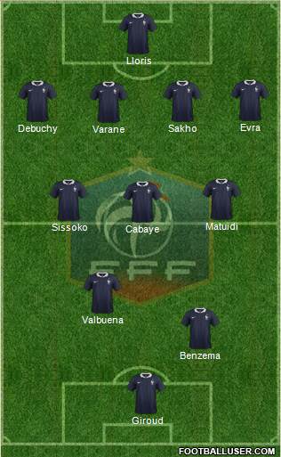 La composition des Bleus : Lloris – Debuchy, Varane, Sakho, Evra – Sissoko, Cabaye, Matuidi – Valbuena, Giroud, Benzema.