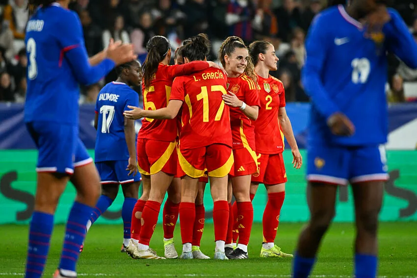 Les Bleues voulaient terminer l’année 2024 sur une bonne note ce soir devant le public de l’Allianz Riviera de Nice. Mais face à des Espagnoles championnes du monde en titre, le challenge était peut-être un peu trop relevé. La Ballon d’Or Aitana Bonmati (6e) a rapidement donné l’avantage à la Roja, profitant d’un excellent centre de Caldentey au premier poteau. D’une frappe décroisée à l’entrée de la surface, sa coéquipière du Barça Claudia Pina (23e) a doublé la mise dans la foulée. La réduction du score de Fernandez (37e) contre son camp, sur un centre puissant de Vicki Becho devant le but, a donné un petit coup de fouet aux Françaises mais pas de quoi revenir à 2-2 avant la pause.