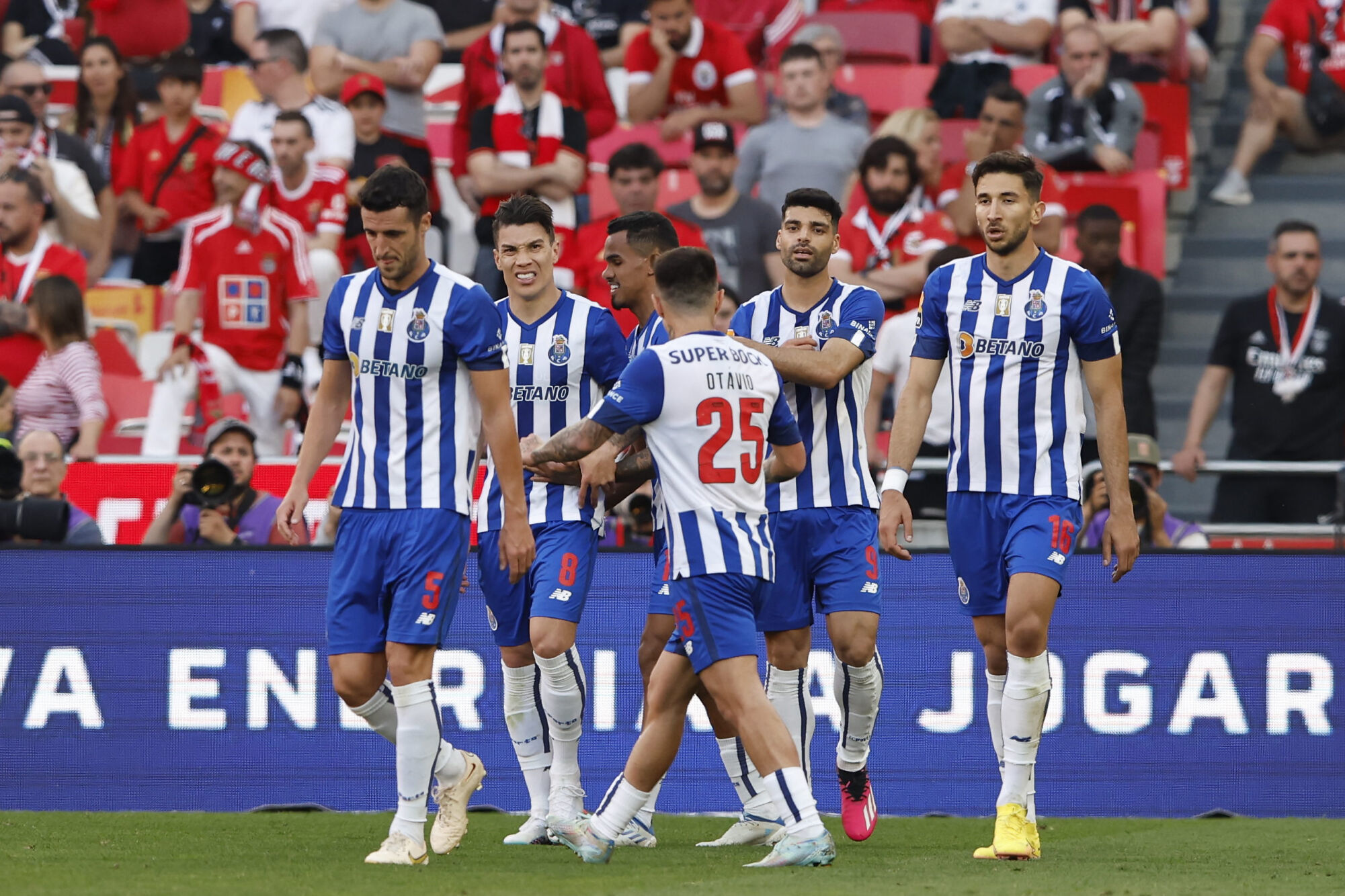 A l’occasion de la 27e journée de la Liga Portugal Bwin, le Benfica, leader avec 71 pts, accueillait le FC Porto à l’Estadio da Luz. Si l’écurie lisboète pouvait définitivement distancer son dauphin et s’adjuger le titre, le Dragoes en ont décidé autrement. Ces derniers l’emportent après avoir été mené très tôt suite à un contre son camp de Diogo Costa (10′). Uribe (45′) puis Taremi (54′) leur ont permis d’inverser la tendance (1-2).