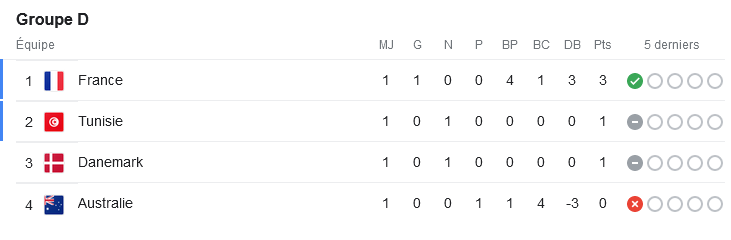 La victoire 4-1 de l’équipe de France face à l’Australie, conjuguée au match nul 0-0 entre le Danemark place les Bleus dans une position idéale dans le groupe D de la Coupe du monde 2022. En cas de victoire face aux Danois lors de la deuxième journée, l’équipe de France pourrait assurer son billet pour les huitièmes de finale.