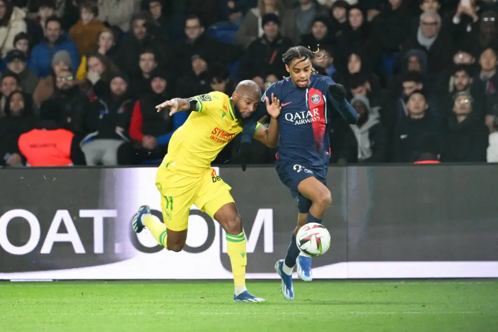 Marcus COCO (Nantes) à la lutte avec Bradley BARCOLA (PSG) (Photo by Christophe Saidi/FEP/Icon Sport)