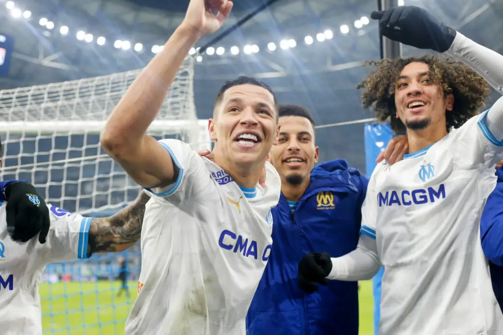 34 Bilal NADIR (om) - 11 Amine HARIT (om) - 08 Azzeddine OUNAHI (om) during the Ligue 1 Uber Eats match between Olympique de Marseille and Olympique Lyonnais at Orange Velodrome on December 6, 2023 in Marseille, France. (Photo by Johnny Fidelin/Icon Sport)