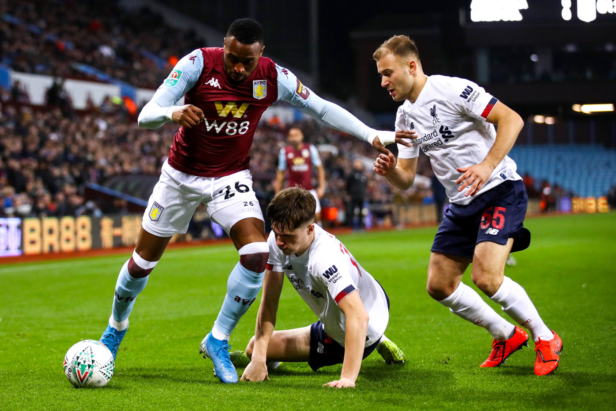 Avec un onze composé de jeunes, en raison de sa participation à la Coupe du Monde des clubs au Qatar, le club de la Mersey a cédé sur des buts de Conor Hourihane (14e), Morgan Boyes (17e csc), Jonathan Kodjia (37e, 45e) et Wesley (92e).