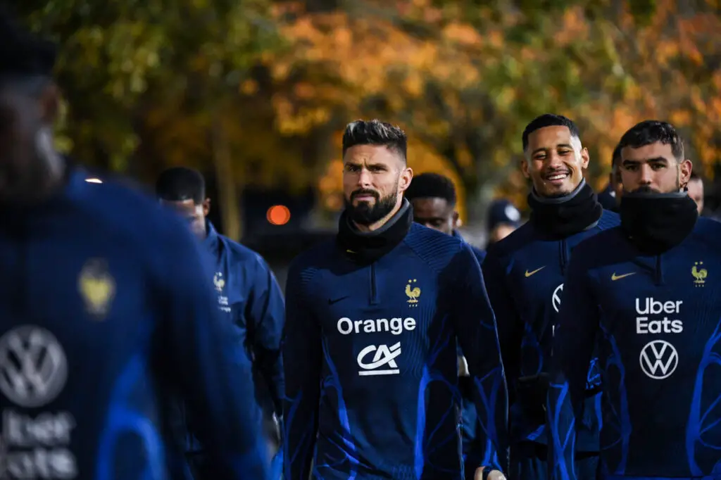Olivier GIROUD of France and Theo HERNANDEZ of France during the French Players a training session at Centre National du Football on November 14, 2023 in Clairefontaine, France. (Photo by Sandra Ruhaut/Icon Sport)