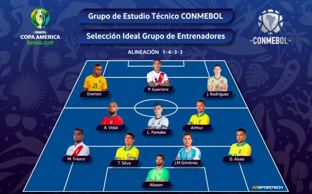 Este é o time ideal da CONMEBOL Copa América Brasil 2019, selecionado pelo Grupo de Estudo Técnico (GET) da @CONMEBOL pic.twitter.com/nhxYSMFODe— Copa América (@CopaAmerica) 9 juillet 2019