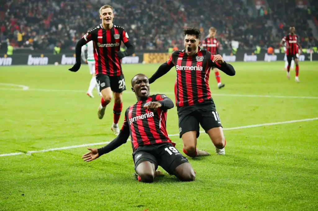 Moussa Diaby, Bayer with Nadiem Amiri and Florian Wirtz - Photo by Icon sport