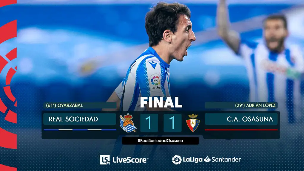 Osasuna avait ouvert la marque sur un penalty transformé par Lopez (29e). La Real Sociedad a égalisé par Oyarzabal (61e) et conserve sa quatrième place au classement.