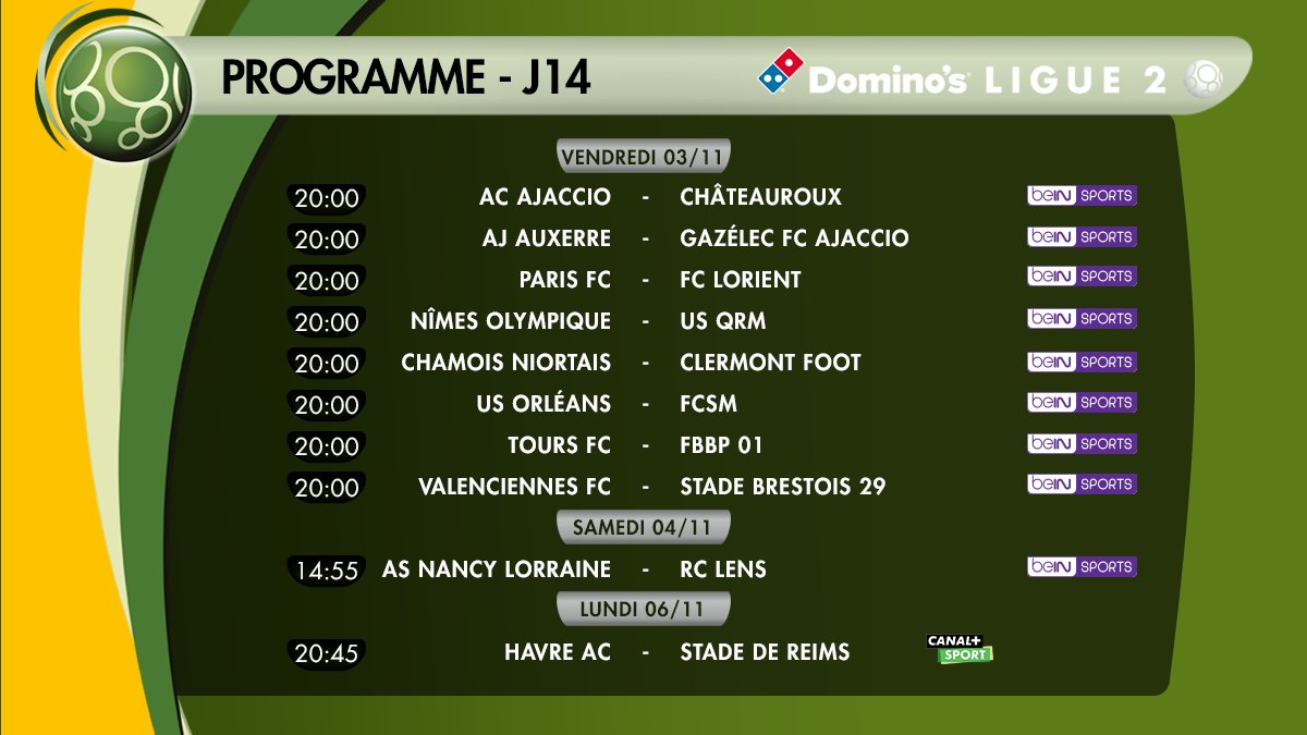 Début de la 14e journée de Ligue 2, ce soir avec 8 matchs au programme. Ajaccio et Nîmes peuvent revenir tout près de la place de leader, Lorient va tenter de mettre le Paris FC à quatre points.