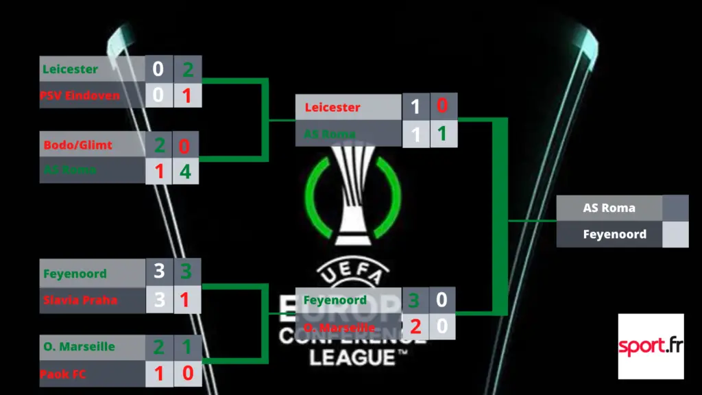 21h – AS Roma (2) 1-0 (1) Leicester https://www.sport.fr/football/las-roma-accede-la-toute-premiere-finale-de-lhistoire-de-la-ligue-europa-conference-893716.shtm