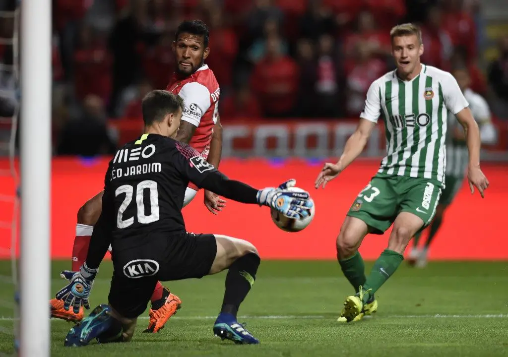 Rio Ave's Brazilian goalkeeper Leo Jardim (L) tries to stop a ball from Sporting Braga's Brazilian forward Dyego Sousa beside Rio Ave's Croatian midfielder Nikola Jambor (R) during the Portuguese league football match between Sporting CP and Rio Ave FC at the Jose Alvalade stadium in Lisbon on October 6, 2018. (Photo by MIGUEL RIOPA / AFP) / The erroneous mention[s] appearing in the metadata of this photo by MIGUEL RIOPA has been modified in AFP systems in the following manner: [Rio Ave's Brazilian goalkeeper Leo Jardim (L) tries to stop a ball from Sporting Braga's Brazilian forward Dyego Sousa beside Rio Ave's Croatian midfielder Nikola Jambor (R) ] instead of [Rio Ave's Brazilian goalkeeper Leo Jardim (L) stops a shot by Sporting Braga's Brazilian forward Dyego Sousa (R) beside Rio Ave's Bissau-Guinean defender Eliseu Nadjack]. Please immediately remove the erroneous mention[s] from all your online services and delete it (them) from your servers. If you have been authorized by AFP to distribute it (them) to third parties, please ensure that the same actions are carried out by them. Failure to promptly comply with these instructions will entail liability on your part for any continued or post notification usage. Therefore we thank you very much for all your attention and prompt action. We are sorry for the inconvenience this notification may cause and remain at your disposal for any further information you may require.