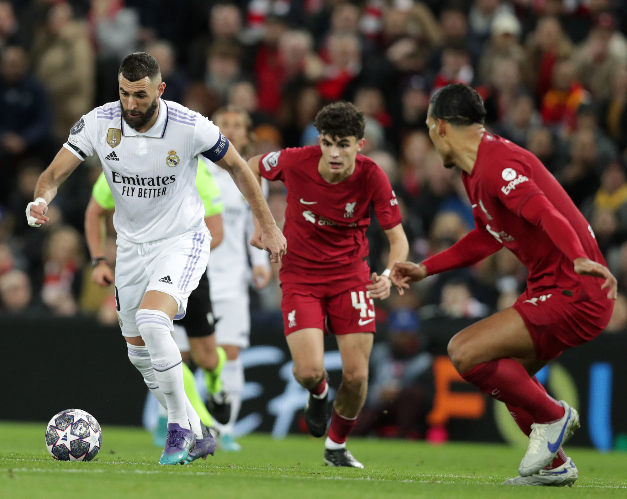 Darwin Nunez ouvre la marque pour Liverpool dès la 4e minutes d’une superbe talonnade, sur une passe de Mohamed Salah. Les Reds doublent la mise dès 14e minute par Mohamed Salah qui profite d’une énorme erreur de Thibaut Courtois. Tout va bien pour Liverpool, Anfield chante… mais cela ne va pas durer. Vinicius réduit la marque dès la 21e minute pour le Real Madrid, puis inscrit un doublé à la 36e ! A la pause : 2-2. Au retour des vestiaires, Eder Militao s’impose de la tête et donne l’avantage aux Merengue. Ce n’est pas terminé : Karim Benzema y va de son but au terme d’une contre attaque éclair et grâce à un sang-froid parfait (55e). Et le Français s’offre lui aussi un doublé sur un service de Vinicius à la 67e minute. Incroyable de réalisme, le Real Madrid a retrourné Liverpool comme un crèpe. Score final : 2-5.