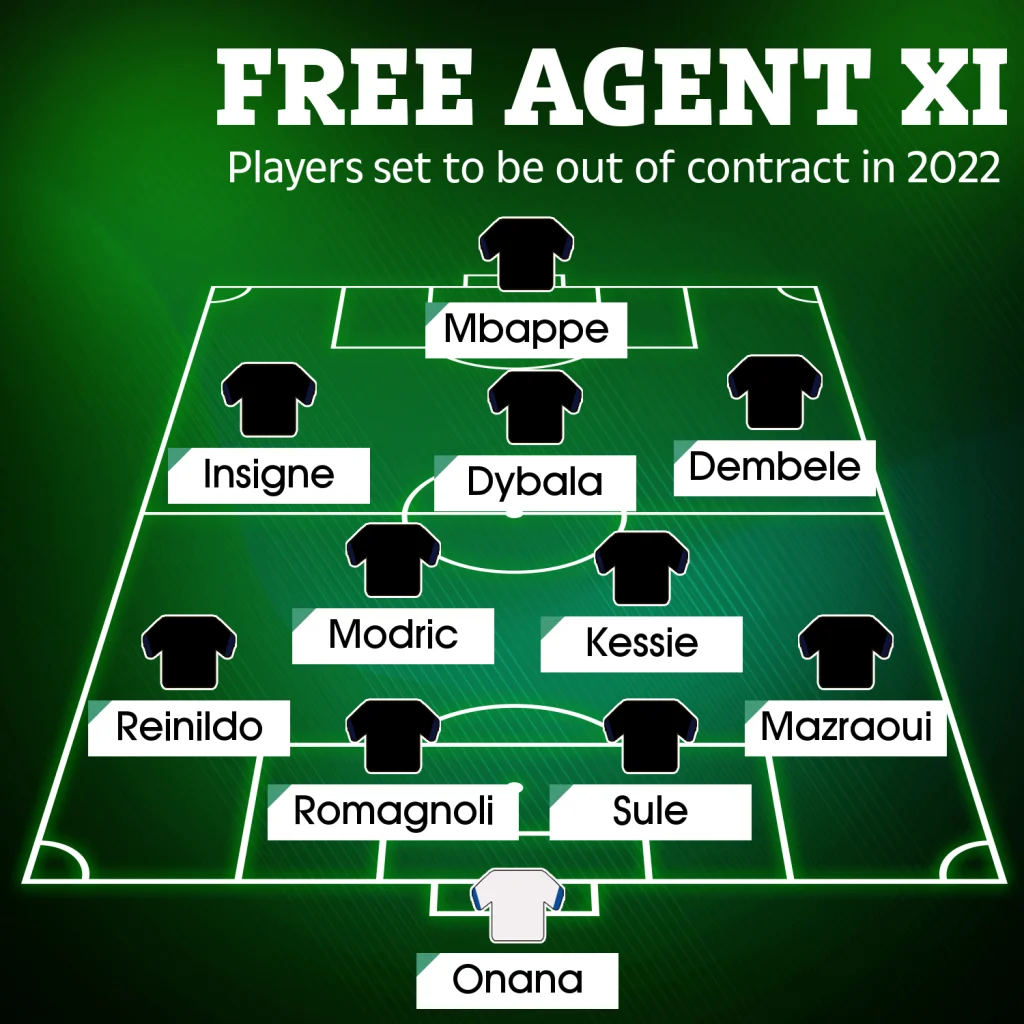 L’équipe est plutôt intéressante sur le papier avec un Kylian Mbappé accompagné par Lorenzo Insigne et Ousmane Dembélé sur les ailes. Et juste derrière l’attaquant du Paris Saint-Germain, Paulo Dybala en numéro 10. Cette équipe n’a bien sur aucune chance d’être alignée dans la réalité mais ce sont onze des meilleurs joueurs d’Europe qui sont en fin de contrat à l’issue de la saison 2021-2022. Pour certains d’entre eux leurs destinations semblent acquises comme Kylian Mbappé au Real Madrid ou encore la prolongation de Dybala à la Juventus mais rien n’est encore officiel. Tous ces joueurs pourront négocier à partir du 1er janvier avec n’importe quelles équipes et pourront si les négociations aboutissent signer un pré-contrat. Au 11 type des joueurs agents libres, du journal The Sun, on peut également ajouter Antonio Rüdiger qui fait partie des joueurs les plus prisés sur le marché.
