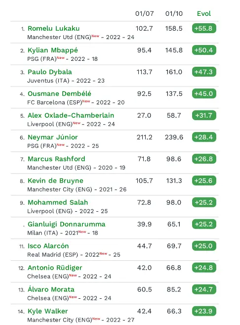 Autre performance, celle de Romelu Lukaku, estimé à 102,7 millions d’euros après son transfert à Manchester United vaudrait aujourd’hui 158,5 M€.