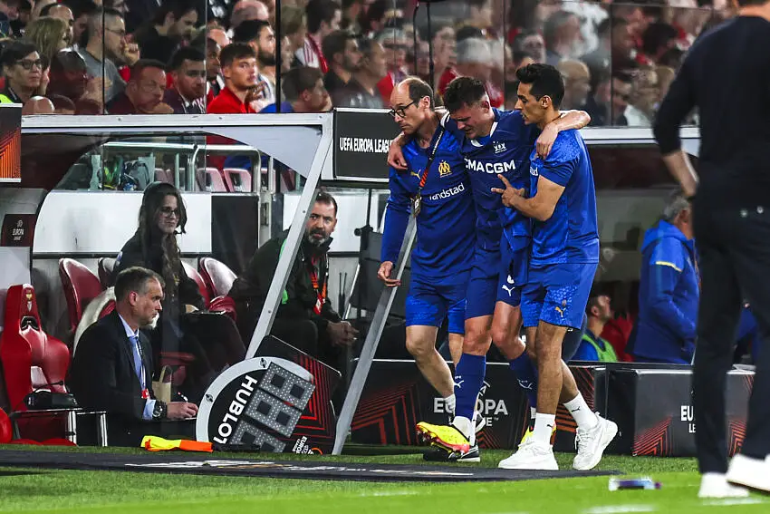 Quentin Merlin, le latéral gauche de l’Olympique de Marseille, a été contraint de quitter le terrain sur civière avant la mi-temps contre Benfica (1-2) en quart de finale aller de la Ligue Europa, suscitant l’inquiétude des supporters et du staff. Selon la radio RMC, le jeune international U23 français souffre d’une importante entorse à la cheville, un diagnostic qui devra être confirmé par des examens. Bien que ce soit une « bonne nouvelle » par rapport à une blessure plus grave au genou, Merlin – qui a quitté le stade de Benfica en béquilles – devrait être absent pendant plusieurs semaines.