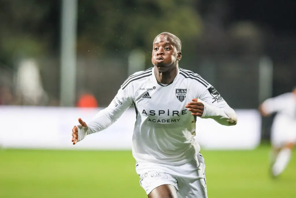 Eupen's Djeidi Gassama celebrates after scoring during a soccer match between KAS Eupen and Standard de Liege, Saturday 05 November 2022 in Eupen, on day 16 of the 2022-2023 'Jupiler Pro League' first division of the Belgian championship. BELGA PHOTO BRUNO FAHY - Photo by Icon sport