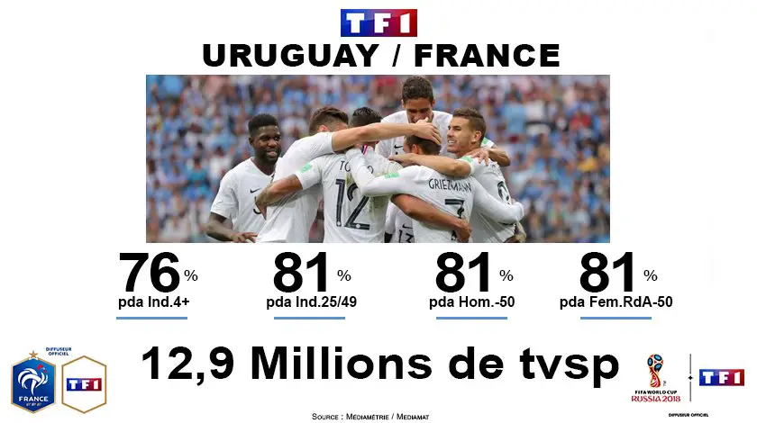 Vendredi 16 heures, une partie de la France s’est arrêtée pour suivre le quart de finale des Bleus contre l’Uruguay (2-0). La rencontre bat le record d’audience de l’année avec 12,9 millions de téléspectateurs en moyenne devant la rencontre pour une part de marché monstrueuse de 81 % ! Le pic d’audience a touché 16,1 millions de téléspectateurs. Pour le précédent match, contre l’Argentine, la chaîne avait réuni 12,5 millions de téléspectateurs et une PDA de 72,1%.