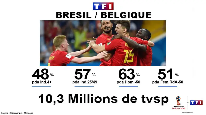 Le soir, le second quart de finale Brésil-Belgique (1-2) a également tout écrasé avec 10,3 millions de téléspectateurs pour voir la victoire des Diables Rouges. Record d’audience pour un match hors équipe de France.