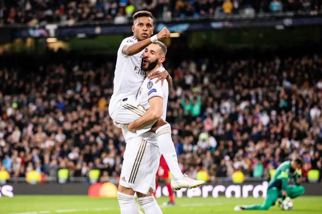Karim Benzema of Real Madrid celebrating after scoring a goal with his teammate Rodrygo Goes during the Champions League match between Real Madrid and Galatasaray at Bernabeu on November 6, 2019 in Madrid, Spain. (Photo by Pressinphoto/Icon Sport) - Stade Santiago-Bernabeu - Madrid (Espagne)
