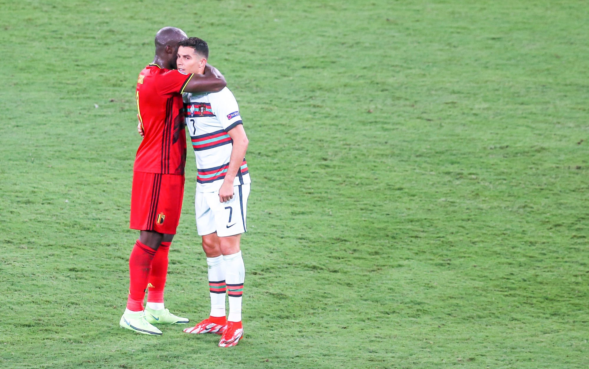 La Belgique s’est imposée sur la plus petite des marges ce dimanche face au Portugal, (1-0), lors des huitièmes de finale de l’Euro 2020. Pourtant dominateurs, les Portugais ont grandement manqué d’efficacité et n’ont pu que s’incliner face à l’un des grands favoris de la compétition. Au terme de la rencontre, Romelu Lukaku (28 ans) est allé réconforter son homologue portugais, Cristiano Ronaldo,(36 ans), très attristé par son élimination précoce. Les deux hommes qui se connaissent désormais très bien, l’un joue à l’Inter et l’autre à la Juventus Turin, se sont entretenus pendant plusieurs minutes sur la pelouse. De belles images d’une classe inégalable.