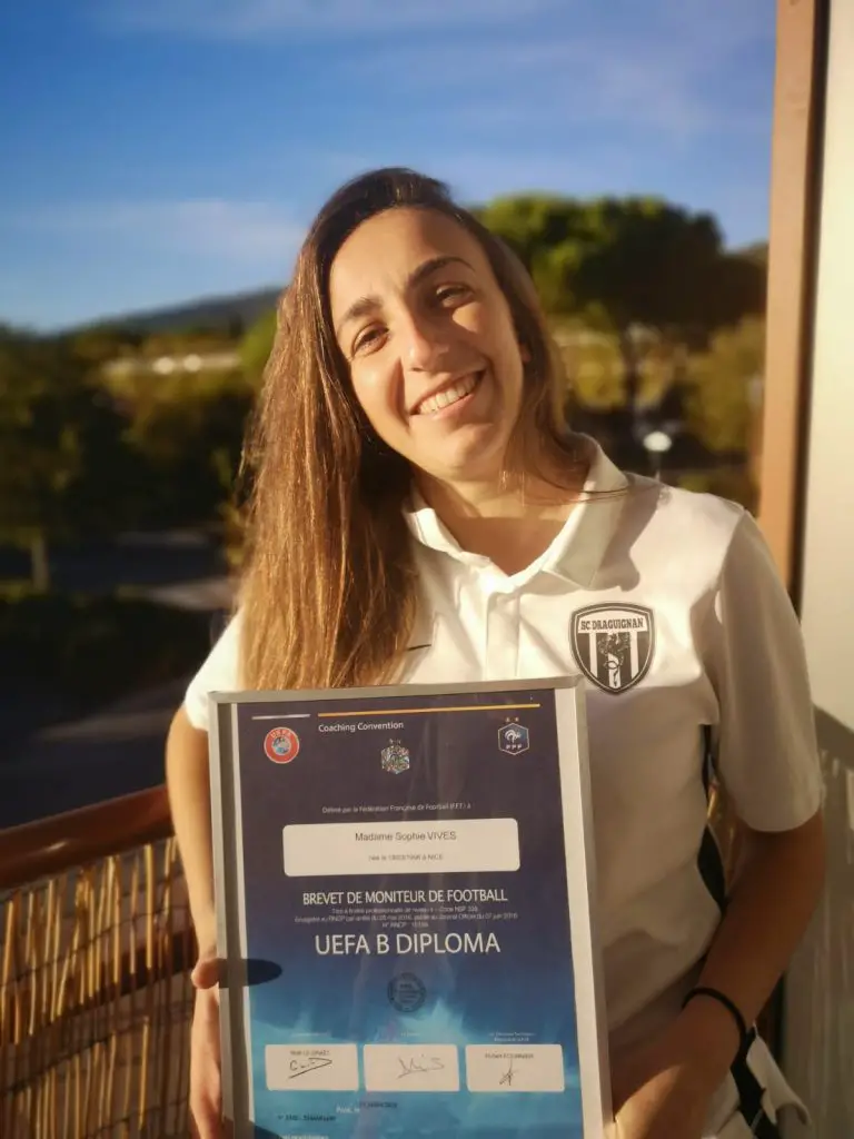 Le ballon rond a toujours fait partie de sa vie. D’abord en loisir, sur les terrains avec ses deux frères dans l’arrière-pays niçois, puis en tant que joueuse à l’OGC Nice et l’AS Monaco. Devenir entraîneure n’a jamais été un rêve, mais plutôt la suite logique des choses. Fraîchement diplômée d’un BPJEPS (brevet professionnel de la jeunesse, de l’éducation populaire et du sport), Sophie crée une section féminine au Stade de Puget-Théniers, dans les hauteurs de Nice. « C’était plaisant d’entraîner et l’équipe a eu un franc succès ! » En 2018, la jeune femme de 24 ans se voit proposer une équipe au Sporting Club Draguignan. Convaincue, elle se lance à l’assaut du diplôme pour devenir entraîneure de football.