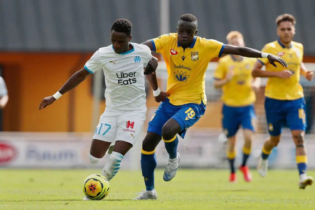 Bouna Sarr, Olympique Marseille, Marseille, Olympique, OM, Sainey Njie, FC DAC 1904 Dunajska Streda, Streda, ganze Figur, Zweikampf,