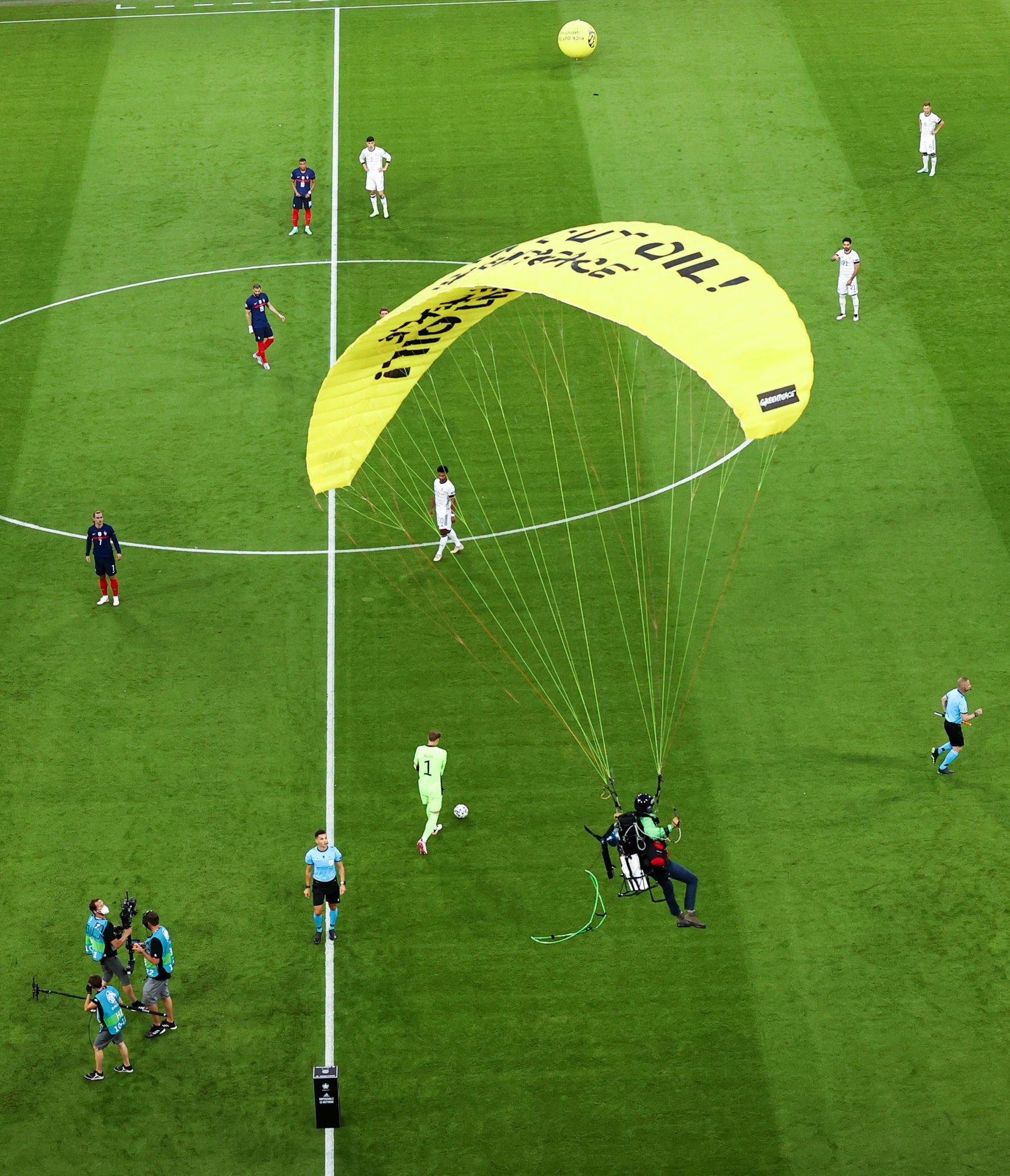 Avant le coup d’envoi de France – Allemagne à l’Allianz Arena de Munich (1-0 à la mi-temps), un militant de Greenpeace a heurté un fil et perdu le contrôle de son ULM. L’appareil a fait un virage au dessus des tribunes avant de terminer sa course sur la pelouse. Deux blessés sont à déplorer.