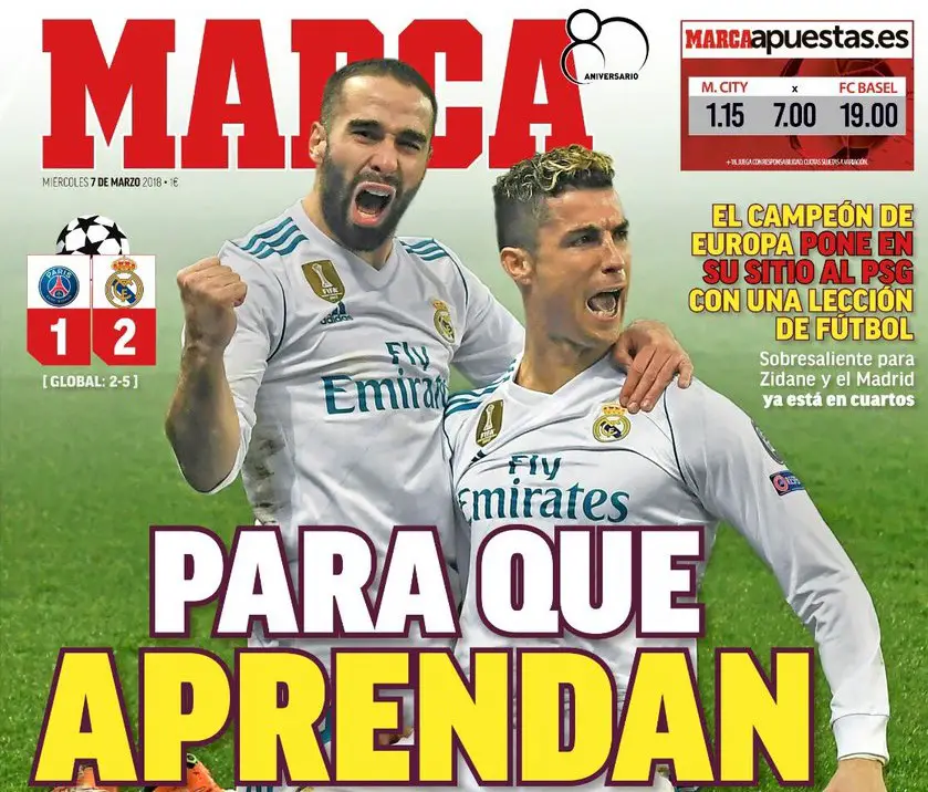 Le quotidien espagnol Marca, pro-Real Madrid, est tout à sa joie et n’hésite pas à chambrer le club parisien. « Pour qu’ils apprennent », titre le tabloïd… qui il est vrai n’avait pas eu l’occasion de se réjouir d’une belle performance des Merengue depuis le début de la saison.