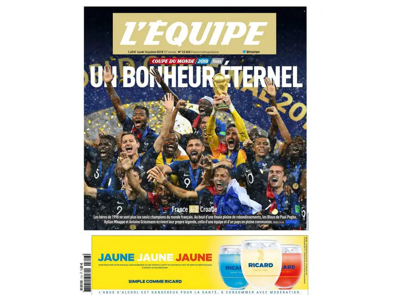 Sur l’ensemble de la Coupe du monde, le journal L’Equipe a augmenté ses ventes de 25 % par rapport à la même période de l’année dernière. Au cours de la journée de lundi, le quotidien a dû procéder à une réimpression de son édition du 16 juillet titrée : « Un bonheur éternel ! » Au total, ce numéro a été tiré à 1,5 million d’exemplaires.