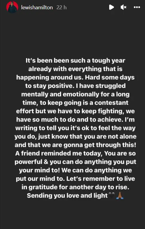 « Difficile de rester positif certains jours. J’ai eu des difficultés au niveau du mental et des émotions pendant un long moment, aller de l’avant est un effort compliqué mais il faut continuer à se battre, nous avons tellement de choses à faire et à accomplir. Je vous écris pour vous dire qu’il n’y a aucun problème à sentir les choses comme vous le faites, sachez juste que vous n’êtes pas seuls et que nous allons tous nous sortir de cette situation !« , a déclaré Lewis Hamilton sur son compte Instagram.