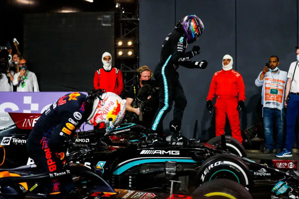 Lewis Hamilton et Max Verstappen à l'arrivée du GP d'Arabie Saoudite. Hoch Zwei / Icon Sport