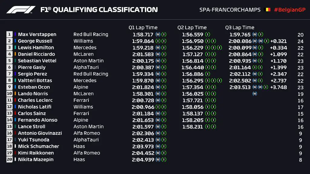 Lewis Hamilton (Mercedes), leader du championnat du monde avec huit points d’avance sur Verstappen avant cette 12e manche de l’année, a été piégé par ces qualifications chamoulées et a réalisé le 3e temps devant Daniel Ricciardo (McLaren). Sebastian Vettel (Aston Martin) et Pierre Gasly (AlphaTauri) figureront en 3e ligne.