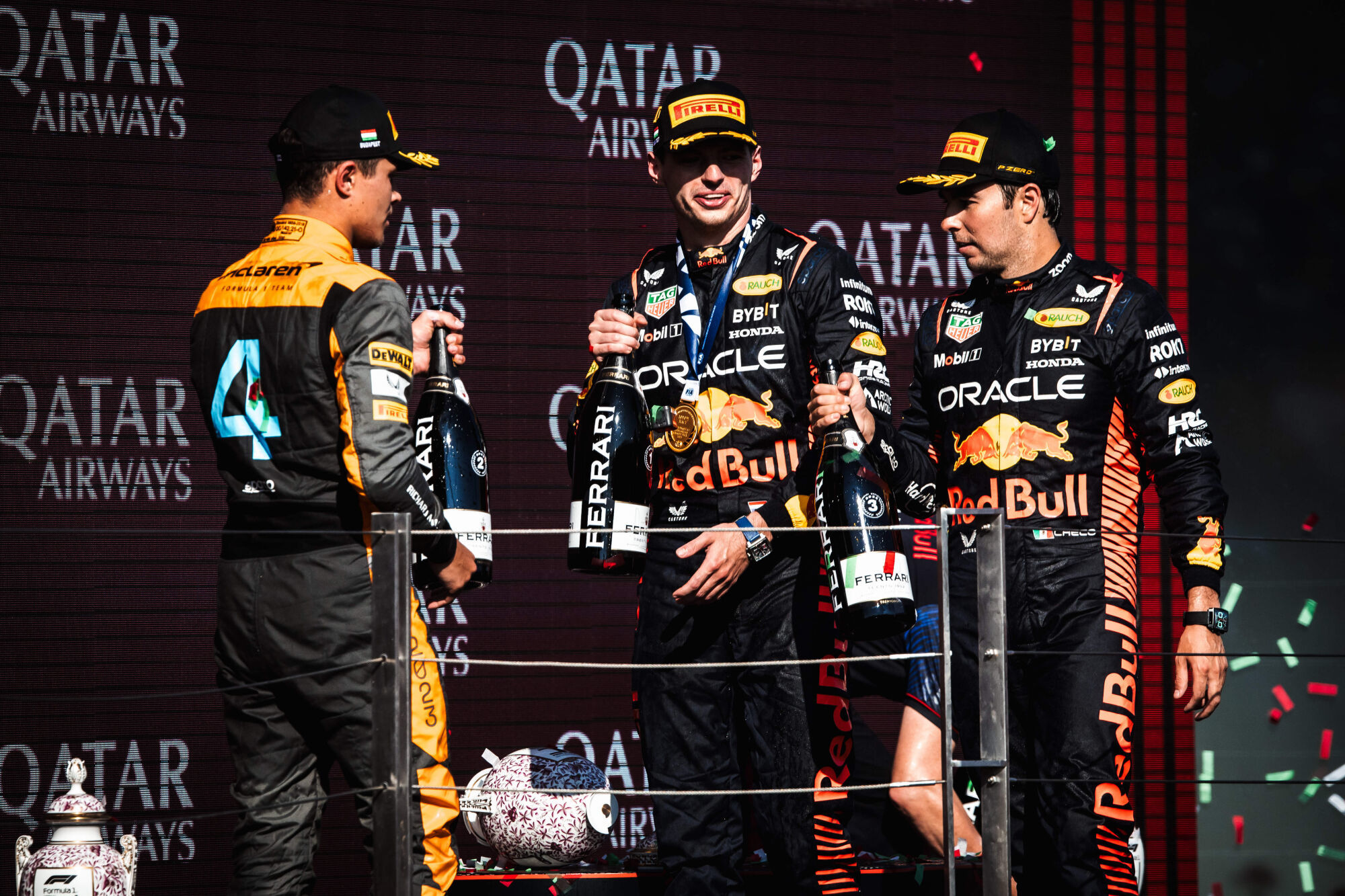 La vidéo de l’incident est devenue virale à travers les réseaux sociaux : Lando Norris, sur le podium du Grand Prix de Hongrie, a décidé de célébrer en débouchant sa bouteille de prosecco. Malheureusement, dans un geste maladroit, il a écrasé la bouteille contre la caisse, faisant involontairement tomber le trophée du vainqueur, Max Verstappen. Le trophée en porcelaine s’est brisé en plusieurs morceaux. D’après le journaliste hongrois Sandor Mezsaros, l’usine Herendi Porcelanmanufaktura nécessitera six mois pour fabriquer une nouvelle pièce, évaluée à 40 000 euros. Heureusement, l’usine s’est déjà mise au travail pour fournir à Verstappen une version réparée pour son étalage.