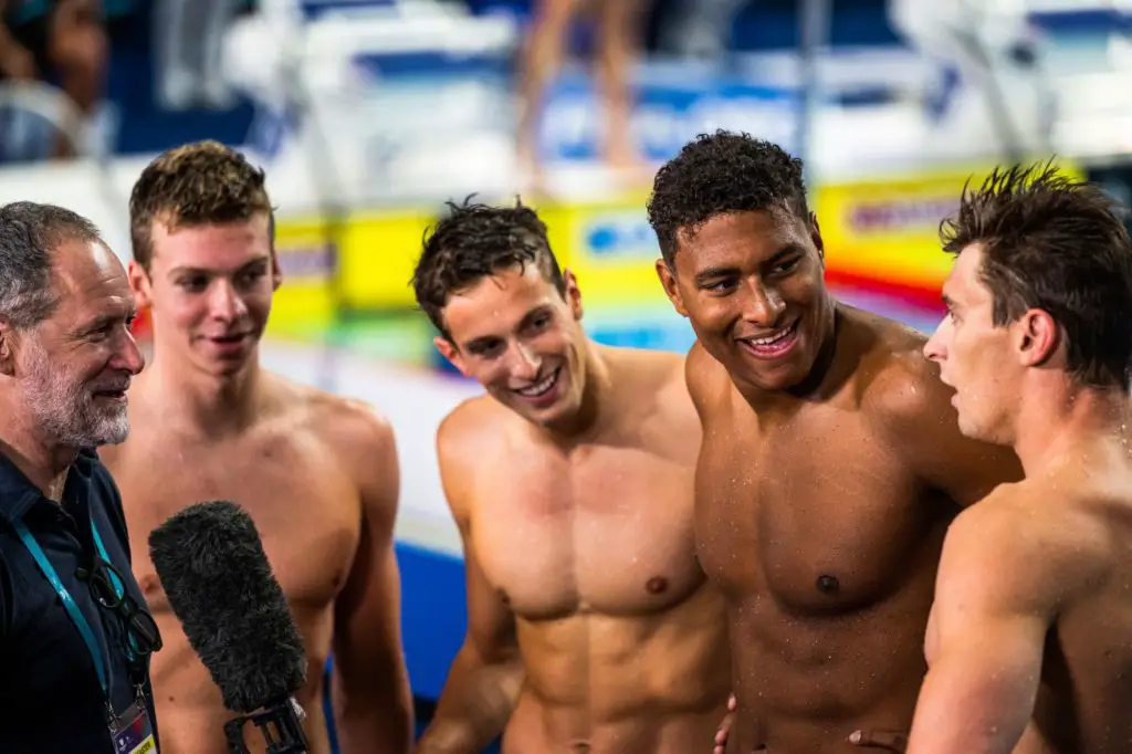 Avec Léon Marchand et Maxime Grousset dans ses rangs, le relais masculin a réalisé le deuxième meilleur temps des séries matinales (3 min 32 sec 98/100), à sept centièmes des Etats-Unis. Avec Yohann Ndoye Brouard et Antoine Viquerat, ils seront de retour dans le